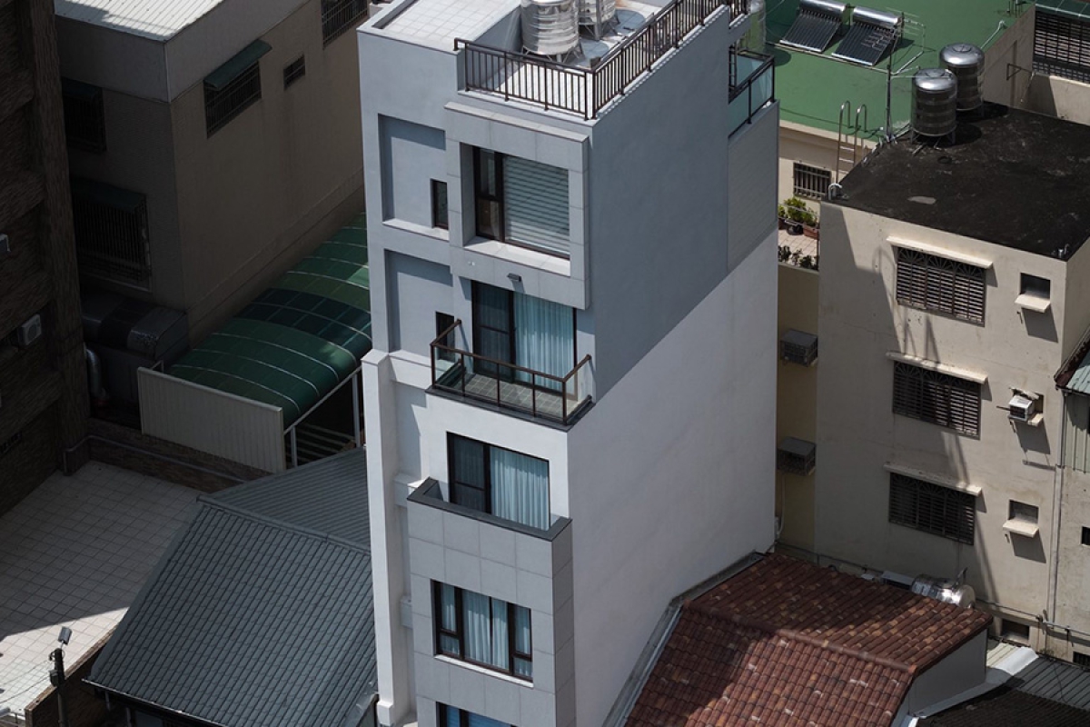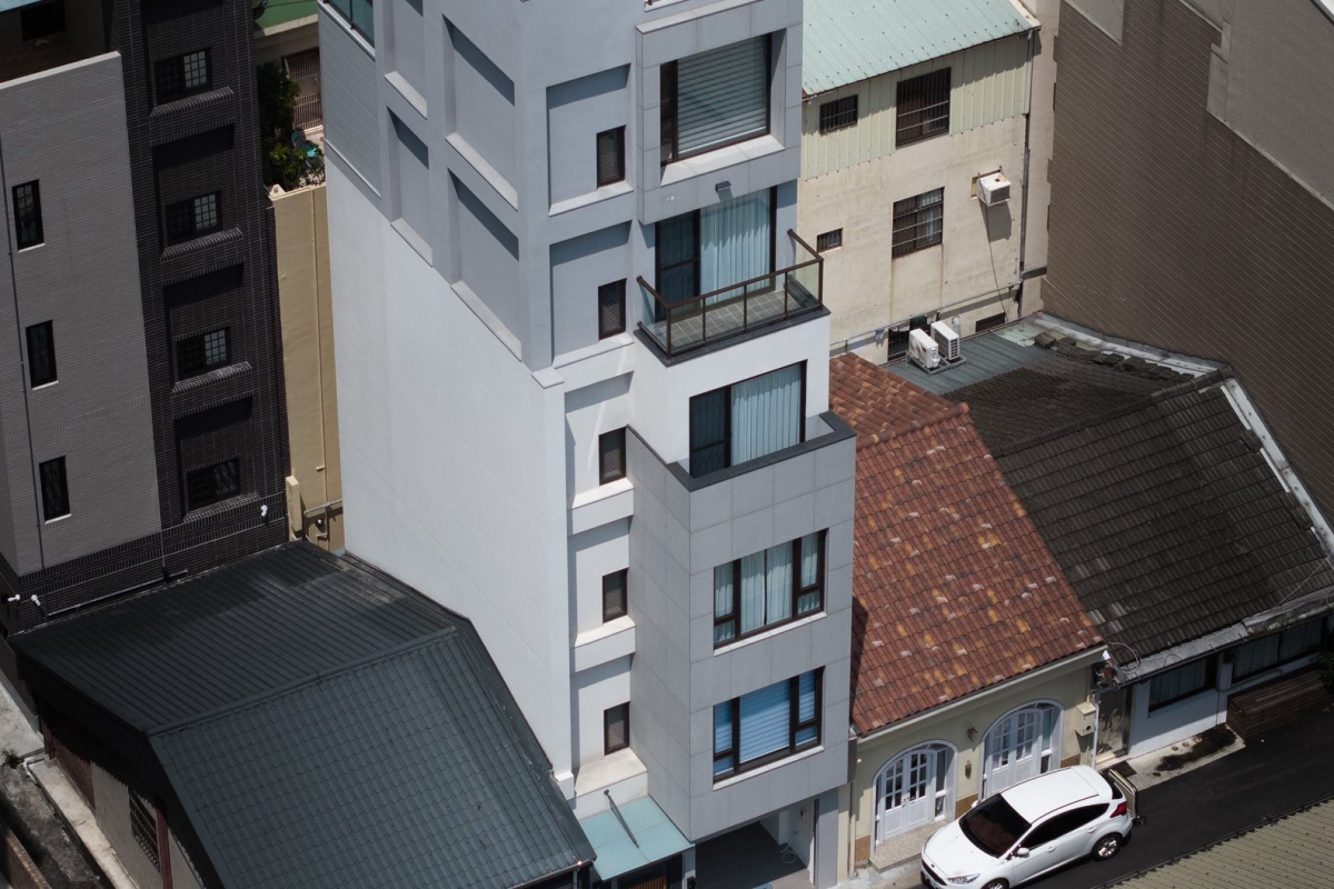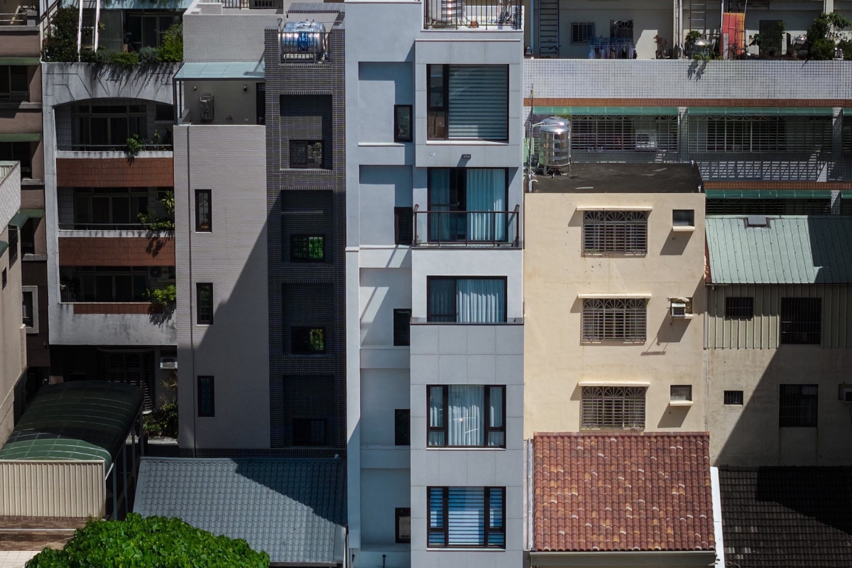 本案位於都市緊密街廓之中,基地面積狹小而深長。建築師以「垂直生活」為設計核心,將建築量體向上發展,形成一棟新加坡式獨棟透天住宅。外觀以石材與塗料為主要材質,透過簡潔的立面比例與開窗節奏,呈現現代住宅的純淨感與秩序性。
